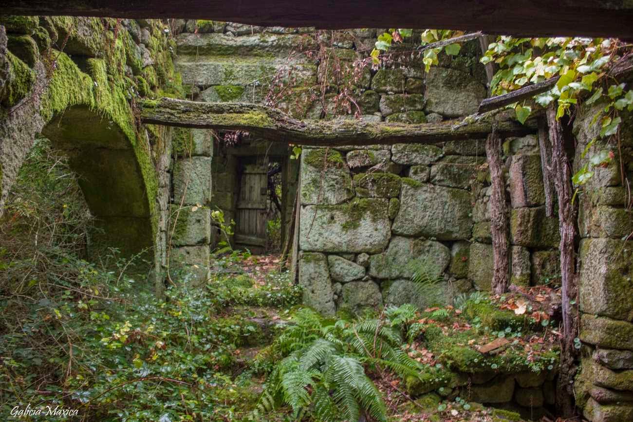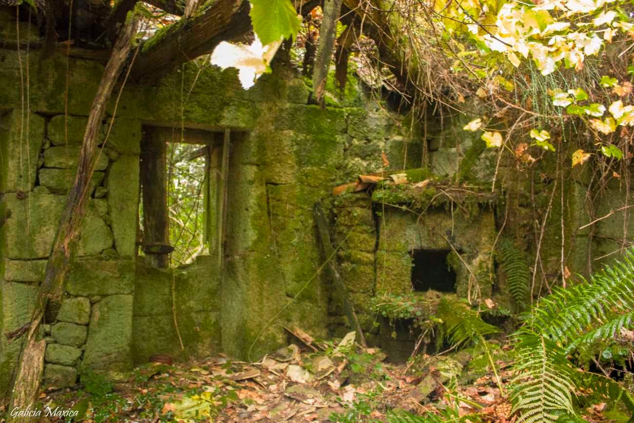 Junto a esta primera casa tenemos la segunda y sin duda la más interesante. Es la conocida como A Casa da Peste. En ella destaca sobre lo demás la presencia de un pórtico formado por dos impresionantes arcos de medio punto creados probablemente por “canteiros” locales ya que es bien sabida la fama de estos en estas tierras. Una fecha escrita sobre un dintel parece indicarnos la época de construcción de la casa. Es el año 1721. La casa amenaza derrumbe por lo que no es aconsejable la entrada en esta para prevenir posibles accidentes. De todas formas, lo más destacado podrá verse desde la entrada de esta casa. Merece la pena ver también las viejas “lareiras” y los huecos en las paredes. Un viejo carballo preside el conjunto principal de la Casa da Peste.