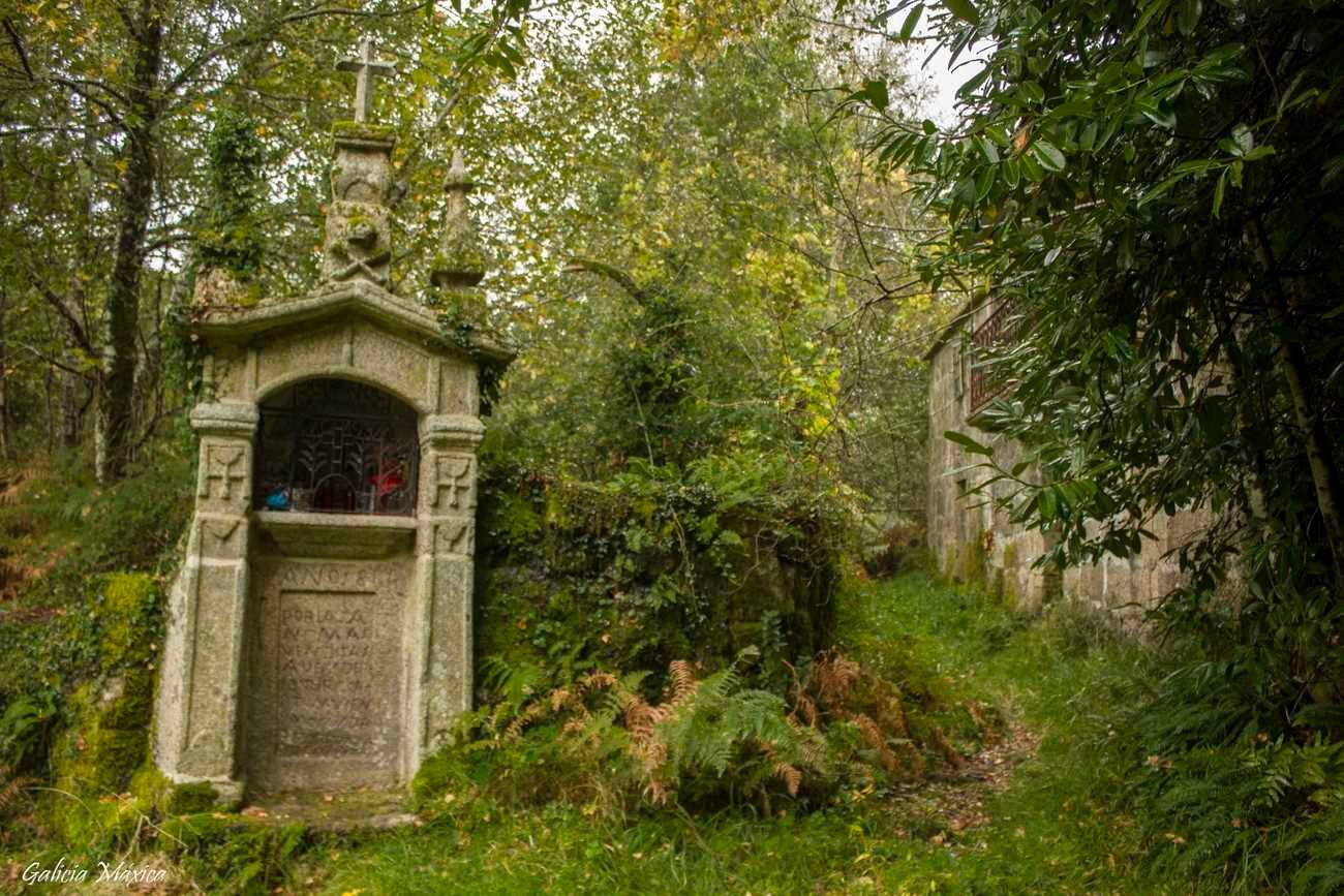 Si seguimos más abajo veremos un espectacular peto del siglo XIX en un cruce de caminos y también podremos ver la fachada trasera de la edificación ya que existe un “carreiro” que se dirige hasta otra construcción abandonada. En esta parte de la casa resalta la gran balconada de forja y poquito más adelante el impresionante y noble hórreo construido completamente en granito y que cuenta con cuatro pares de pies.